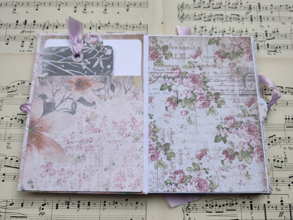 Dziś mam dla Was prosty projekt, czyli albumik wykonany z dwóch papierów scrapowych, kawałka wstążki i jednokolorowego papieru A4. Wymiary około 11 x 16 cm, grubość około 0,5 cm, czyli jest mały i poręczny, a daje nam wszystkie wspominane wyżej możliwości.